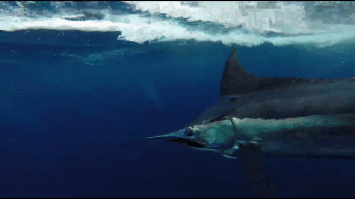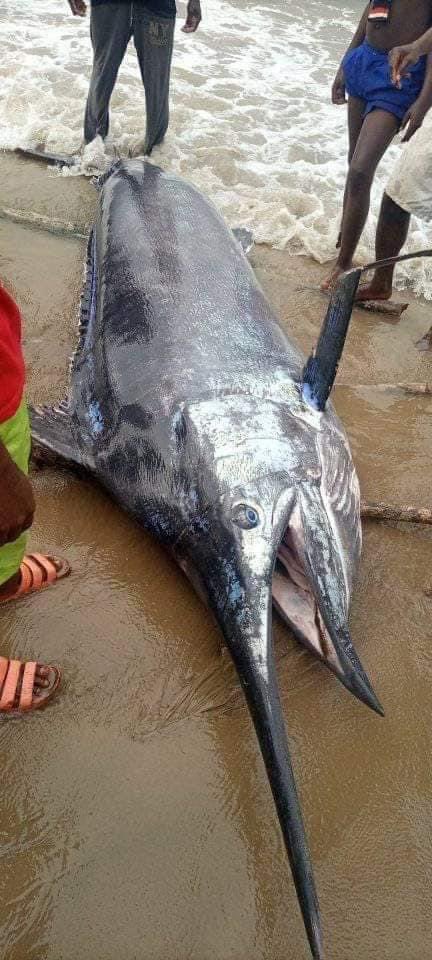 " Swordfish (Xiphias gladius), are large, highly migratory predatory fish characterized by a long, flat, pointed bill. They are a popular sport fish of the billfish category, though elusive. Swordfish are elongated, round-bodied, and lose all teeth and scales by adulthood. These fish are found widely in tropical and temperate parts of the Atlantic, Pacific, and Indian Oceans, and can typically be found from near the surface to a depth of 550 m (1,800 ft), and exceptionally up to depths of 2,234 m. They commonly reach 3 m (10 ft) in length, and the maximum reported is 4.55 m (14 ft 11 in) in length and 650 kg (1,430 lb) in weight. They are the sole member of their family, Xiphiidae. The swordfish is named after its long pointed, flat bill, which resembles a sword. The species name, Xiphias gladius, derives from Greek ξιφίας (xiphias, "swordfish"), itself from ξίφος (xiphos, "sword") and from Latin gladius ("sword"). This makes it superficially similar to other billfish such as marlin, but upon examination, their physiology is quite different and they are members of different families. Several extinct genera are known, such as a large sized Xiphiorhynchus and Aglyptorhynchus.[8] Unlike modern taxa these have equally long lower jaws.[citation needed] Description They commonly reach 3 m (10 ft) in length, and the maximum reported is 4.55 m (14 ft 11 in) in length and 682 kg (1,500 lb) in weight. The International Game Fish Association's all-tackle angling record for a swordfish was a 536 kg (1,182 lb) specimen taken off Chile in 1953. Females are larger than males, and Pacific swordfish reach a greater size than northwest Atlantic and Mediterranean swordfish. They reach maturity at 4–5 years of age and the maximum age is believed to be at least 9 years. The oldest swordfish found in a recent study were a 16-year-old female and 12-year-old male. Swordfish ages are derived, with difficulty, from annual rings on fin rays rather than otoliths, since their otoliths are small in size. Temperature regulation Swordfish are ectothermic animals; however, along with some species of sharks, they have special organs next to their eyes to heat their eyes and brains.Their eyes are heated to temperatures measured between 10 to 15 °C (18 to 27 °F) above the surrounding water temperature, this heating greatly improves their vision, and consequently improves their ability to catch prey. The swordfish is one of 22 fish, including the marlin, tuna, and some sharks, known to have a mechanism that conserves heat.